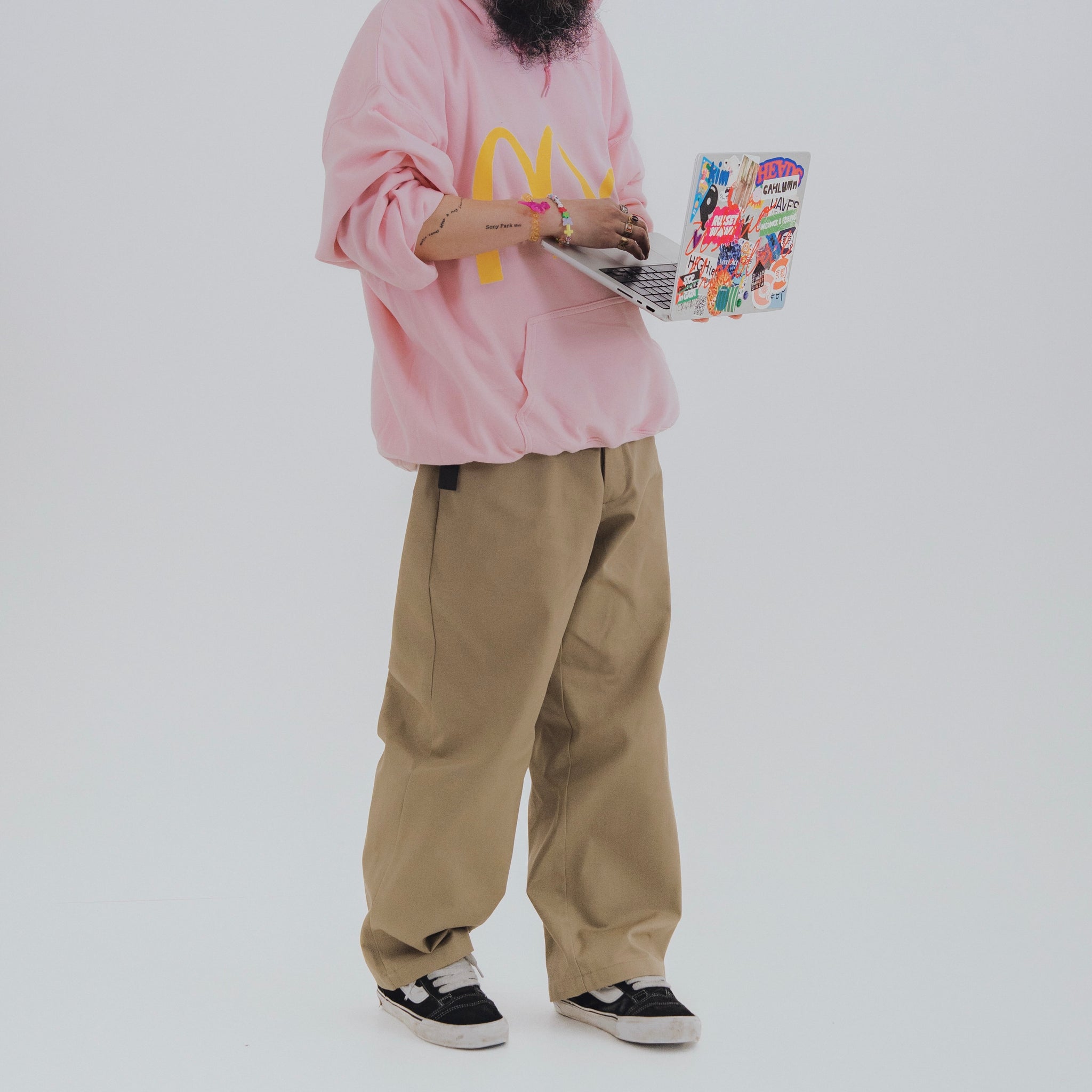 コットン素材のワイドシルエットで、ボタンフライや太いベルトループ、ウエスト前面に配されたネームなど、現在とは異なるディテールが数多く存在していました。今回のモデルは、そのシルエットとディテールを忠実に再現しています。