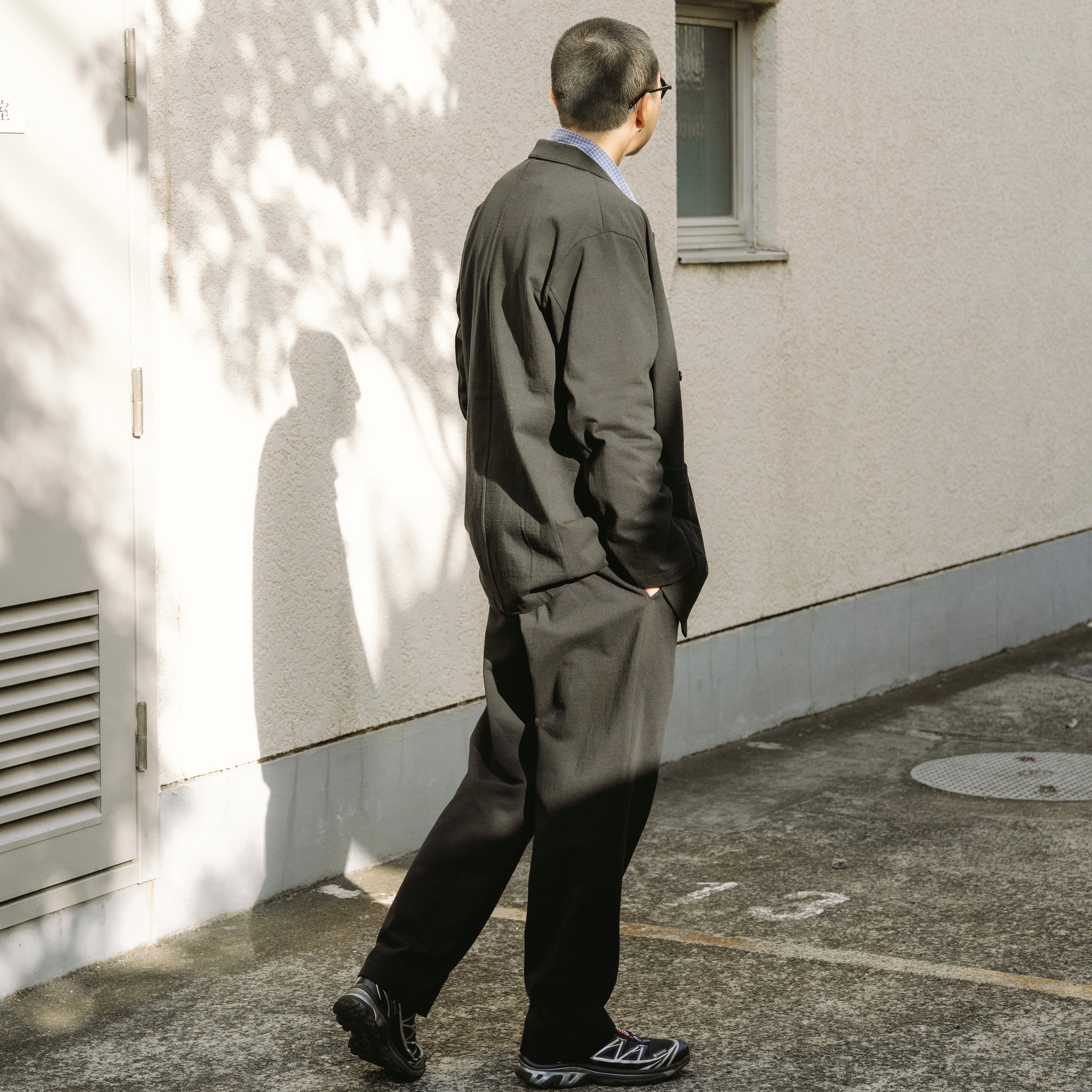 今作ではジャケットをダブルブレスト仕様へ、パンツを2アウトタック仕様へアップデートし、よりフォーマルで構築的な佇まいへと進化させました。