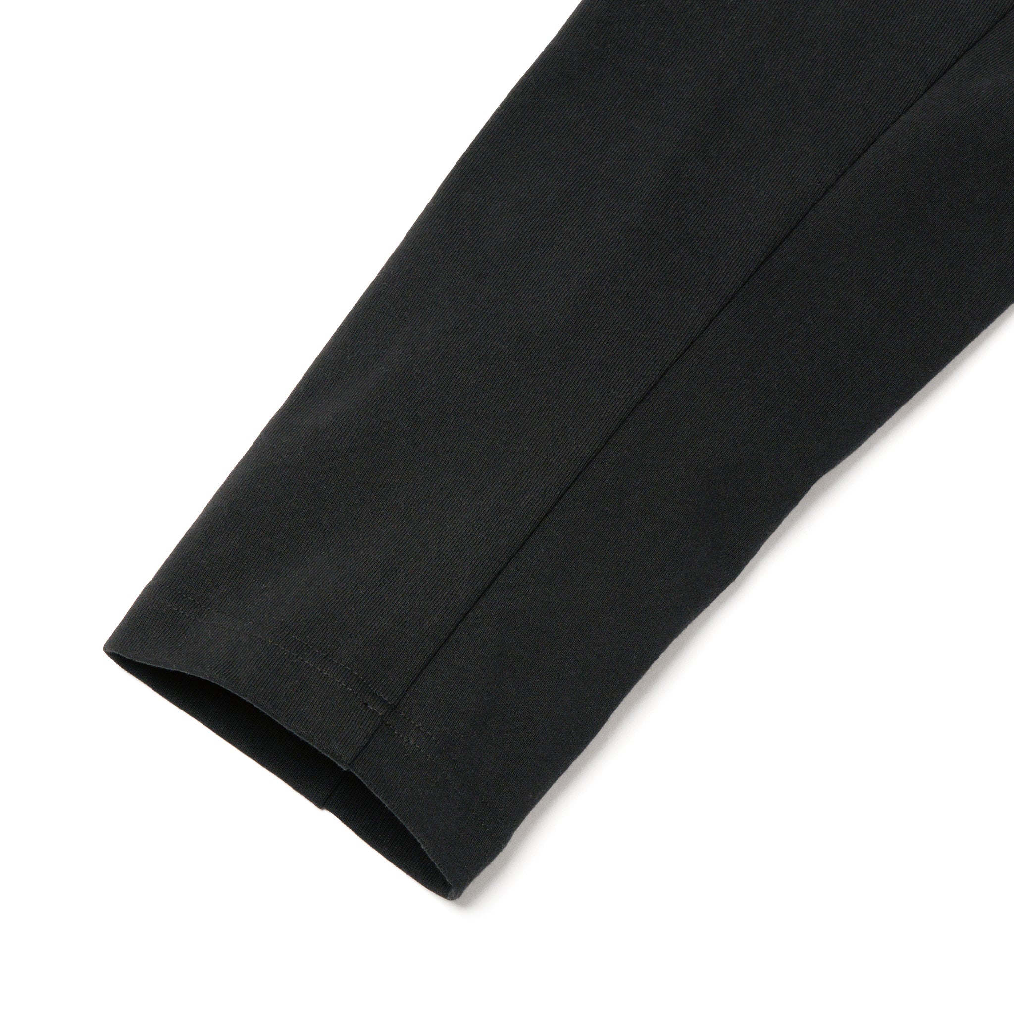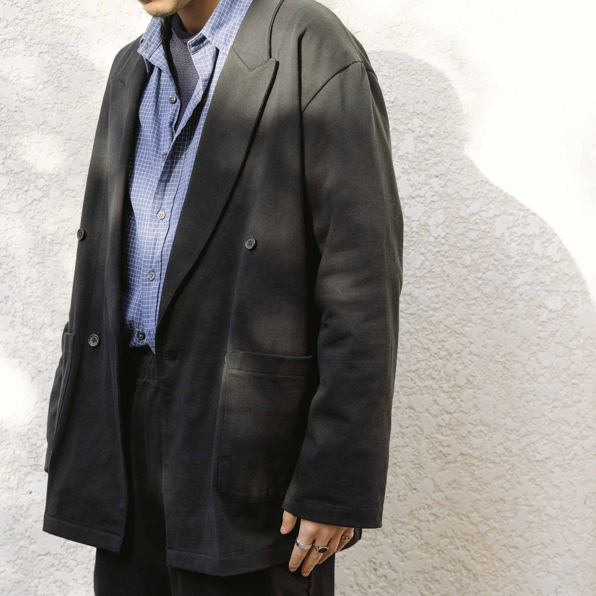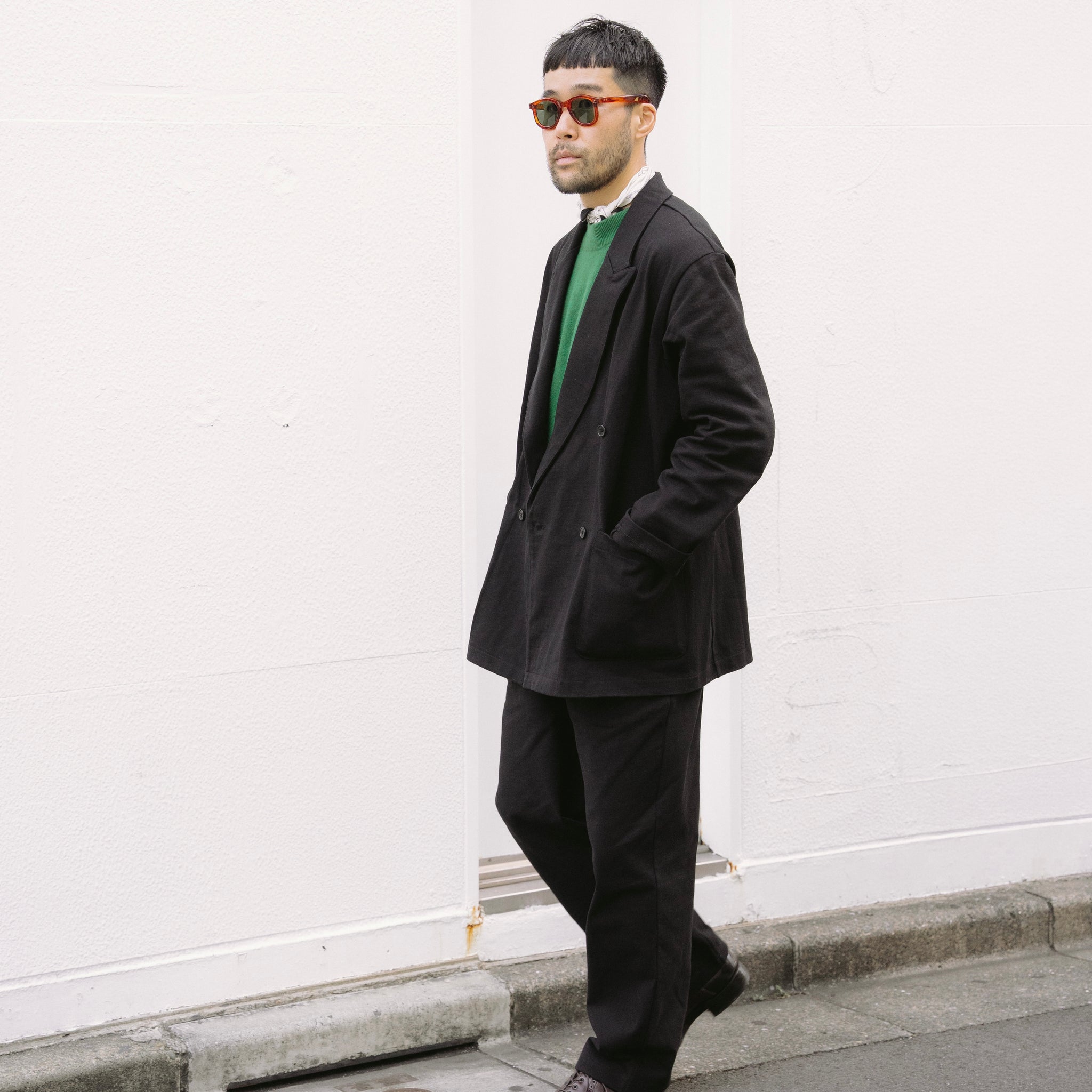 重厚感あるコットン100%のヘビーウェイト天竺生地(12オンス)を使用し、従来のスーツ概念を覆す新しいスタイルを実現。カットソー素材ならではの快適な着心地と、クラシックなフォーマルスタイルを融合しています。