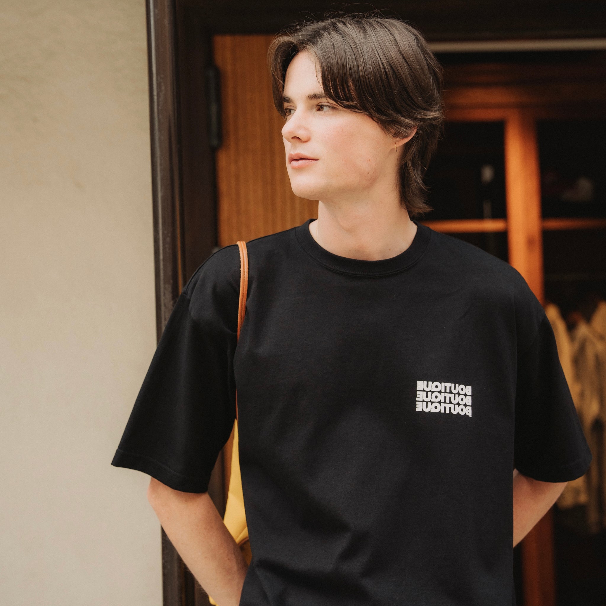 胸元にはBOUTIQUEロゴをさりげなく配置。スタイリングの邪魔をせず、程よいアクセントとして機能します。