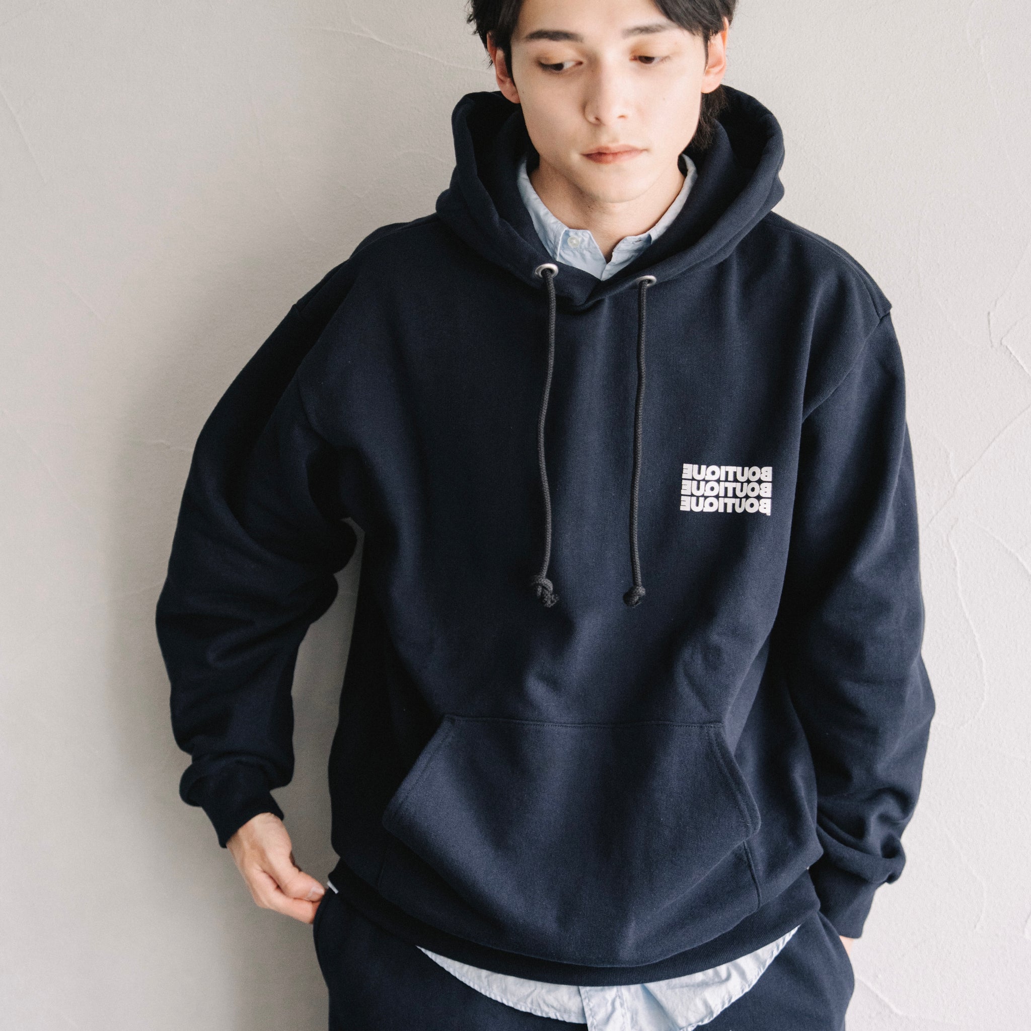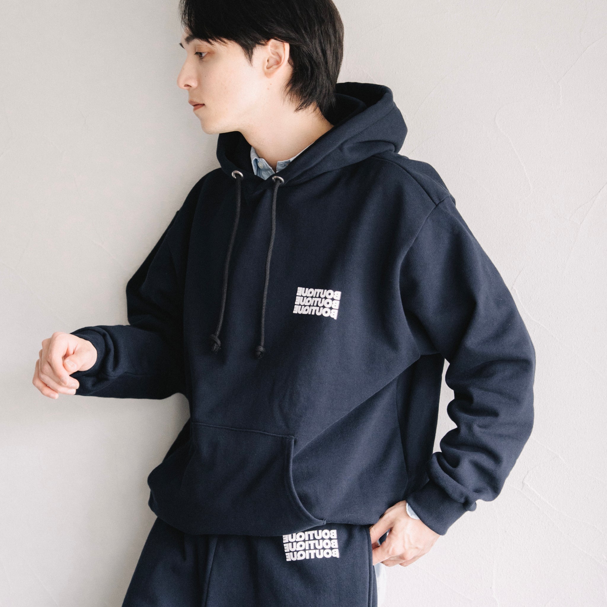 BOUTIQUEの新しいプルオーバーフーディー(スウェットパーカー)。シルエットは大きすぎないリラックスフィット。一枚で着ても、アウターのインナーとしても自然に馴染むバランスです。