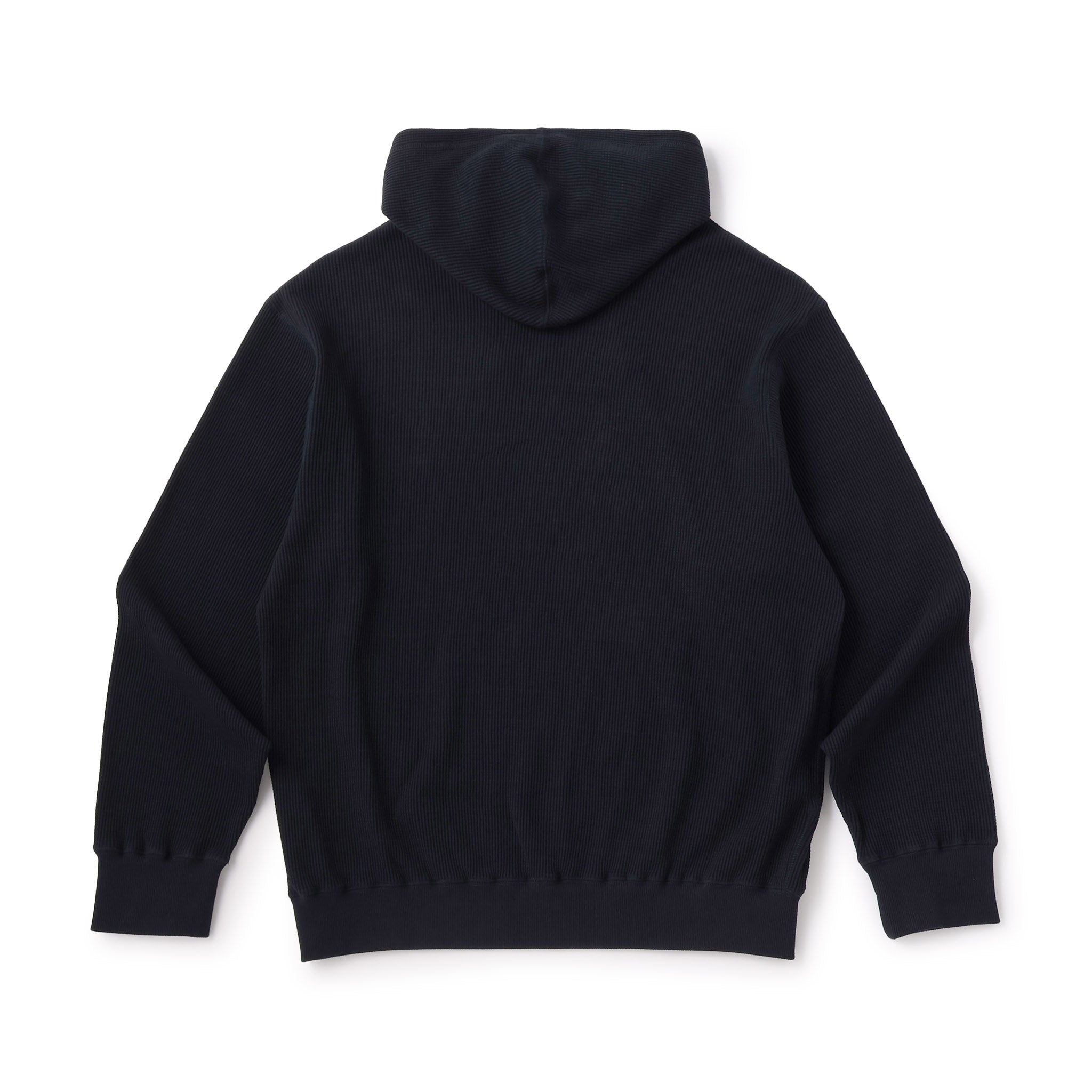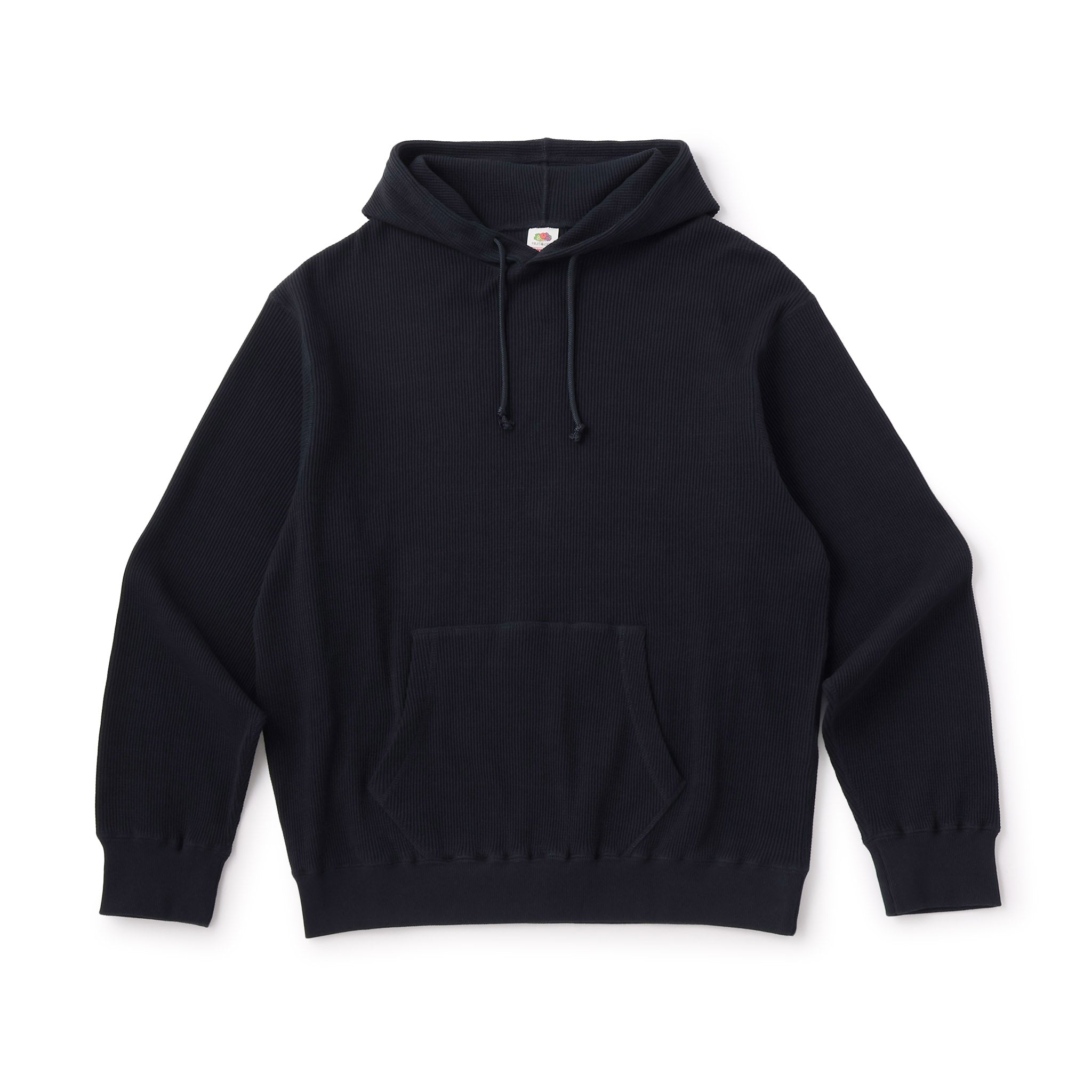 カンガルーポケットに三本針ステッチを施すなどヴィンテージ感を演出。サーマル生地特有軽やかな着心地とフーディー機能性を両立。